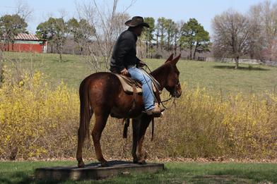 She is my go to mule for hog hunting. You can lead dogs on her and pack dead hogs out. She has had lots of arena time - she takes her leads great, neck reins, side passes and has a good stop and turn around. She is easy to catch, clip and shoe. She stands good to mount. She loads in any type of trailer.